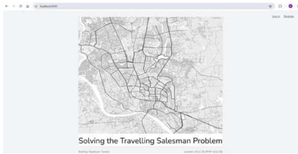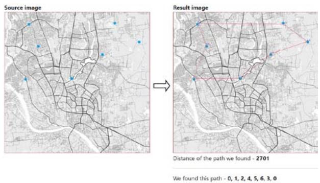 The algorithm needed an interface to be able to solve real life tsp problems. We built a web application by php language for that purpose. The application uses laravel framework. It receives data from an API simulated via another php library [4]. Both applications have to be run simultaneously for the simulation to work. We built up the input to be used for the API application. We first took a map of Dhaka city. The API recognizes nodes to be of a different colour from the map background. Thus, we picked a black and white map. We use the colour blue as the node colour. The specific RGB code for the colour is (0,163,232). This is important because the API has an option for specifying the colour of the nodes. If the colour does not match up, the data does not get properly rendered. A user can change the colour code according to his need. Or they can simply pick the option that says: "The colors of nodes on a graph are different from background color". This forces the API to analyze the image for background colour and any differences in the image. But this process is often not reliable and has been noted to fail during testing. User discretion is advised. The input image is then analyzed by the application. It can accept anywhere from 2 to 500 nodes. An average user is unlikely to need that many destination points. For that and also for the sake of simplicity, we chose 7 nodes over different parts of the map. The image would be used as a template by the algorithm to generate a second image. The newly generated image will have paths denoted between the nodes. The paths also have an approximate weight value calculated by the algorithm. The algorithm uses this new weighted graph format to calculate the most optimal path of travel for the user.