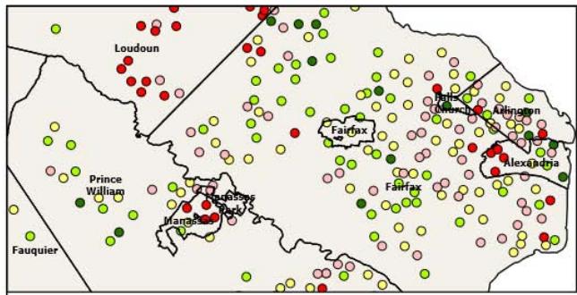 Figure 1 below depicts the spatial variation of CWI across the Commonwealth of Virginia based on the CWI quintiles. Majority of the elementary schools in the Richmond Metro Area and Chesterfield County fall under the very low quintile. In contrast, in the Eastern region of the Commonwealth (such as Virginia Beach, Norfolk, Chesapeake), majority of the elementary schools fall within the "High" and "Very High" Quintiles. A similar situation is seen in Northern Virginia (such as Fairfax). The variation in CWI across counties in Virginia may be related to existing socioeconomic, educational, and structural disparities. For example, median income in Fairfax was reported as $145,165 compared to$ 59,606 in Richmond city (U.S. Census Bureau, 2023). Similarly, the proportion of the population below $100\%$ poverty line was $5.9\%$ in Fairfax, which is significantly less than the proportion in Richmond city ( $19.5\%$ ) (U.S. Census Bureau, 2023). Disparities across education also exist. The U.S. Census Bureau (2023) reported high school graduation rate of $93.5\%$ in Fairfax and $88.8\%$ in Richmond. The on-time graduation rate in Richmond was $72.5\%$, which is much lower than Fairfax ( $93.3\%$ ). Unfortunately, the drop-out rate reported was significantly higher in Richmond ( $23.7\%$ ) compared to $5.4\%$ in Fairfax (U.S. Census Bureau, 2023).