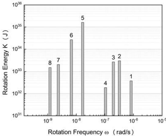 Table 1 lists the data of mass, angular frequency, rotating radius, and vibrating amplitude of the eight major planets. The rotational and vibrational energies are calculated according to equation (17). Fig. 4 shows the rotational energy spectrum, and Fig. 5 shows the vibrational energy spectrum of the solar system.