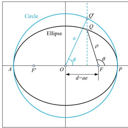 Fig. 2: The elliptic orbit is represented by parameters $(a, \phi)$. Point $Q'$ on the circle is a mapped image of point $Q$ on the ellipse.