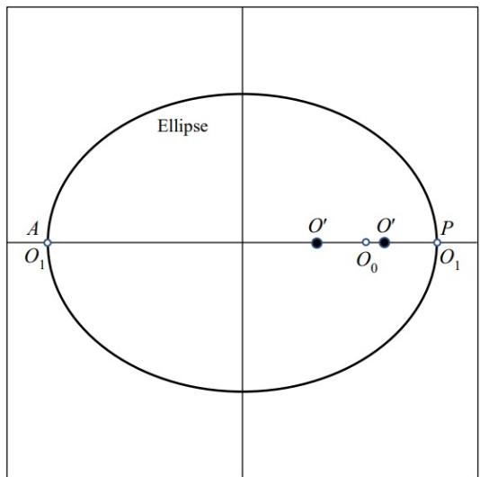 Fig. 3: The motion of a two-body cluster. When planet $O_{1}$ is located at the perihelion $P$ and the aphelion $A$, the barycenter $O'$ is situated to the right and left of $O_{0}$, respectively. Both $O_{0}$ and $O_{1}$ move around the barycenter $O'$ in elliptic orbits.