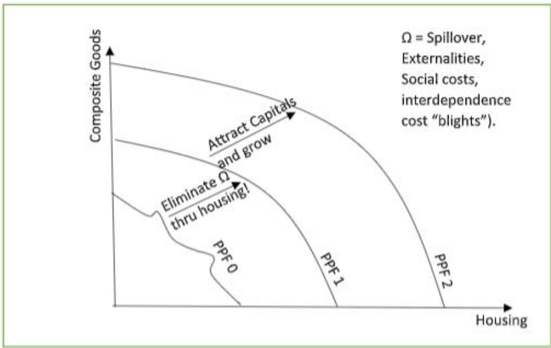 As seen in figure 1, many nations of the world are underdeveloped because they are stuck on PPF0. They cannot move to their initial production frontier (PPF1) due to the presence of externalities—inefficient resource allocations. Reallocation of resources requires inclusive housing programs along with essential complementary quasi-public goods, as described in the next section. This would move these societies to efficient PPF1 and attract capital for growth and development (PPF2). PPF0 has an unusual shape because it does not comply with the concept of opportunity cost.