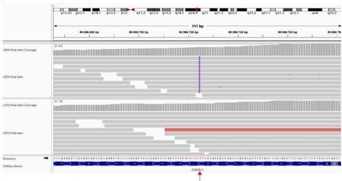Raw reads were trimmed, and mapped to the human reference genome (GRCh37) using the Burrows-Wheeler Aligner v0.7.8-r455 (BWA) \[3\](doi: 10.1093/bioin formatics/btp698). Duplicate reads were marked in BAM files with Picard v1.111 and variant calling was performed using the GATK v3.8 \[4\](doi: 10.1101/gr.107524.110). The percentage of reads mapped to the reference genome for all the samples was above $99.9\%$ and the fraction of the targeted region covered with at least 10X was above $95\%$, for all samples. Variant call format (VCF) files were annotated and analyzed using the VarSeq v2.2.3 software. Variants were filtered using a multigene panel: ADGRV1, ARSG, CDH23, CIB2, CLRN1, CRTAC1, ESPN, HARS1, MYO7A, PCDH15, PDZD7, USH1C, USH1G, USH2A and WHRN; minimum allele frequency $(\mathsf{MAF}) < 0.01$ according to gnomAD genome and exome variant frequencies v2.1 [5](doi:10.1038/s41586-020-03174-8); protein effect, including missense, indels, frameshift and splicing site variants; and family segregation, assuming an autosomal recessive inheritance model.