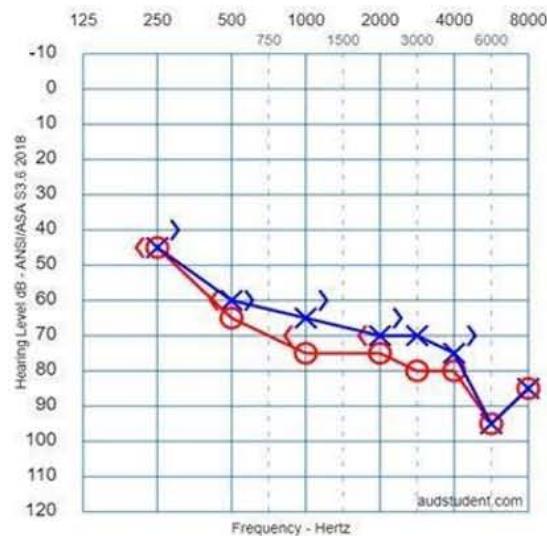 Figure 1D. BAM Archives Figure 1B. Index patient right eye funduscopy. Pink optic disc, with 0.2 excavation, with defined edges, attenuated/retinal vessels of central emergence, speckled pattern with granulation of the retinal pigmented epithelium, presence of bone spicules towards the equator, clear vitreous. Figure 1C. Tonal audiometry of the index case. Right ear: anacusis. Left ear: severe sensorineural hearing loss. Figure 1D. BAM file showing the patient homozygous for the mutant allele (US04) and homozygous for the Wild Type allele (US02).