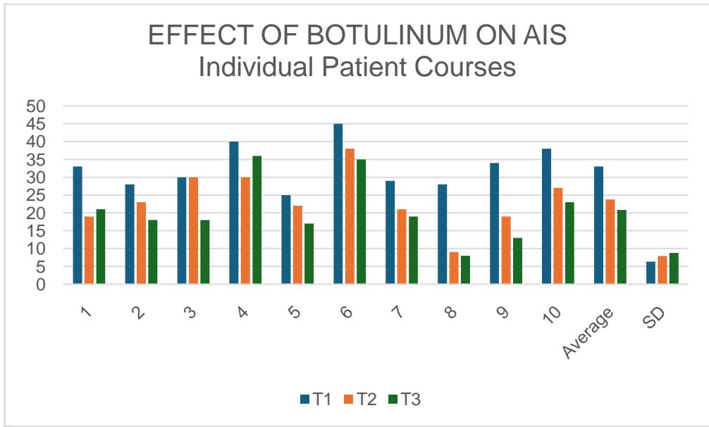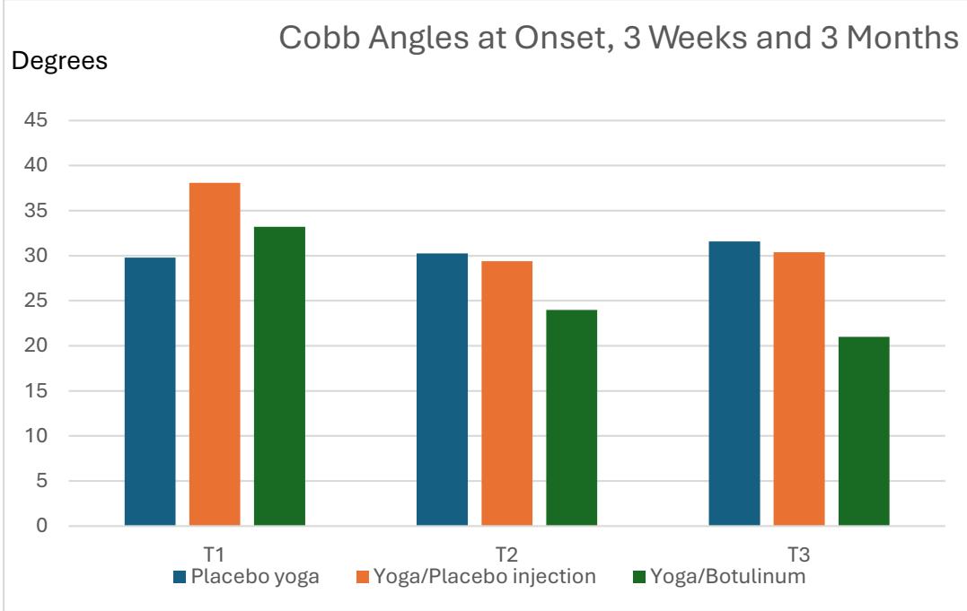Significant improvement in Cobb angles at three weeks post-botulinum-injection in Groups 2 and 3 vs. Group 1 supports the hypothesis that some AIS is due at least in part to muscular imbalance, and that efforts to strengthen the convex muscles and temporarily weaken the concave muscles reverse the scoliosis significantly. Previous work with children with cerebral palsy had been ineffective and possibly dangerous,[25] but EMG work with children having AIS reveals that botulinum toxin alters side-to-side muscle recruitment ratios.[36] The simultaneous use of yoga and incobotulinum seems to have several advantages even after the two-month period of the medicine's activity: