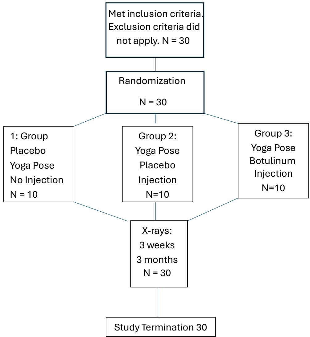 This is a randomized, controlled study, with two non-botulinum groups: Group 1 received a placebo yoga pose only, while Group 2 received the intervention yoga pose and preservative-free normal saline (placebo) injections. The full intervention group, Group 3 received both the interventional yoga pose and botulinum injections.