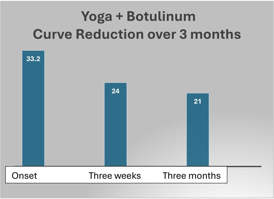 Each patient or the parents of patients under 18 read and signed the Informed Consent Form. A medical assistant enrolled the patients; the office manager generated the randomized treatment group. The medical assistant prepared the syringe with preservative-free normal saline or lyophilized incobotulinum plus 1 cc of preservative-free normal saline, both colorless liquids. The participants, care providers and radiologists performing the initial and subsequent scoliosis X-rays and measuring Cobb angles were all blinded regarding group assignment. Apart from Group 1, which performed the two-handed 'placebo' yoga pose, and which of necessity was different in appearance from the intervention yoga pose, and the fact that this group had no injection, all procedures were indistinguishable to participants, care givers and radiologists. Mixed effects regression analyses were used to test the hypotheses, since differences between three groups was sought.