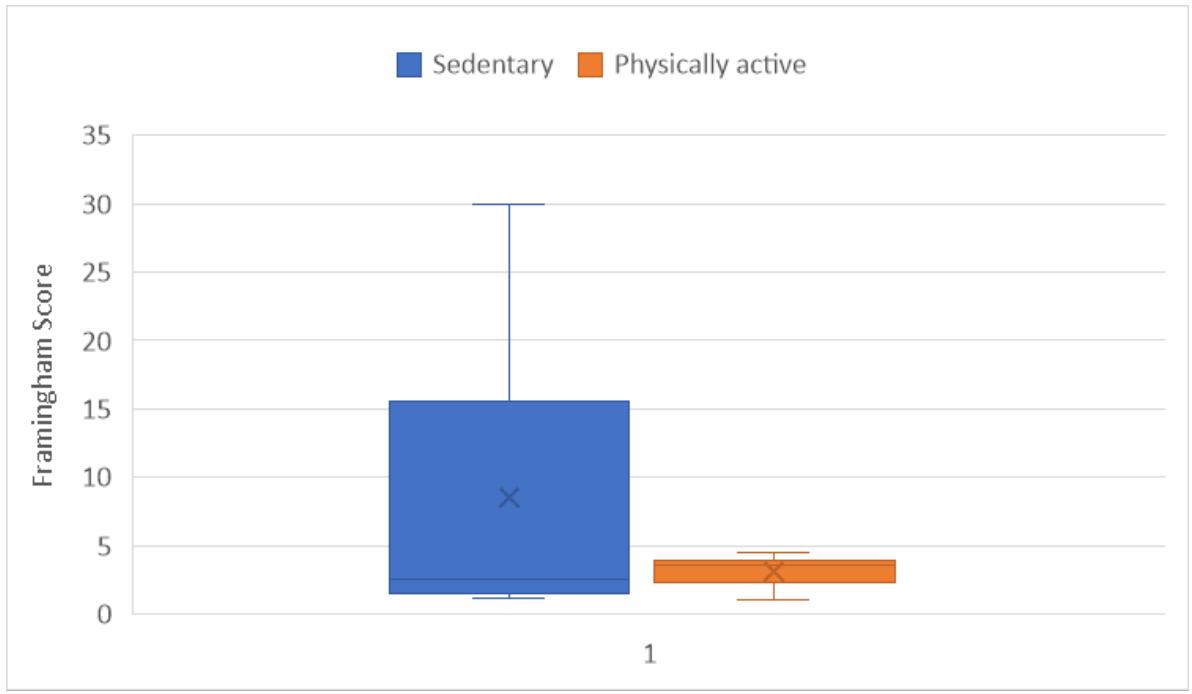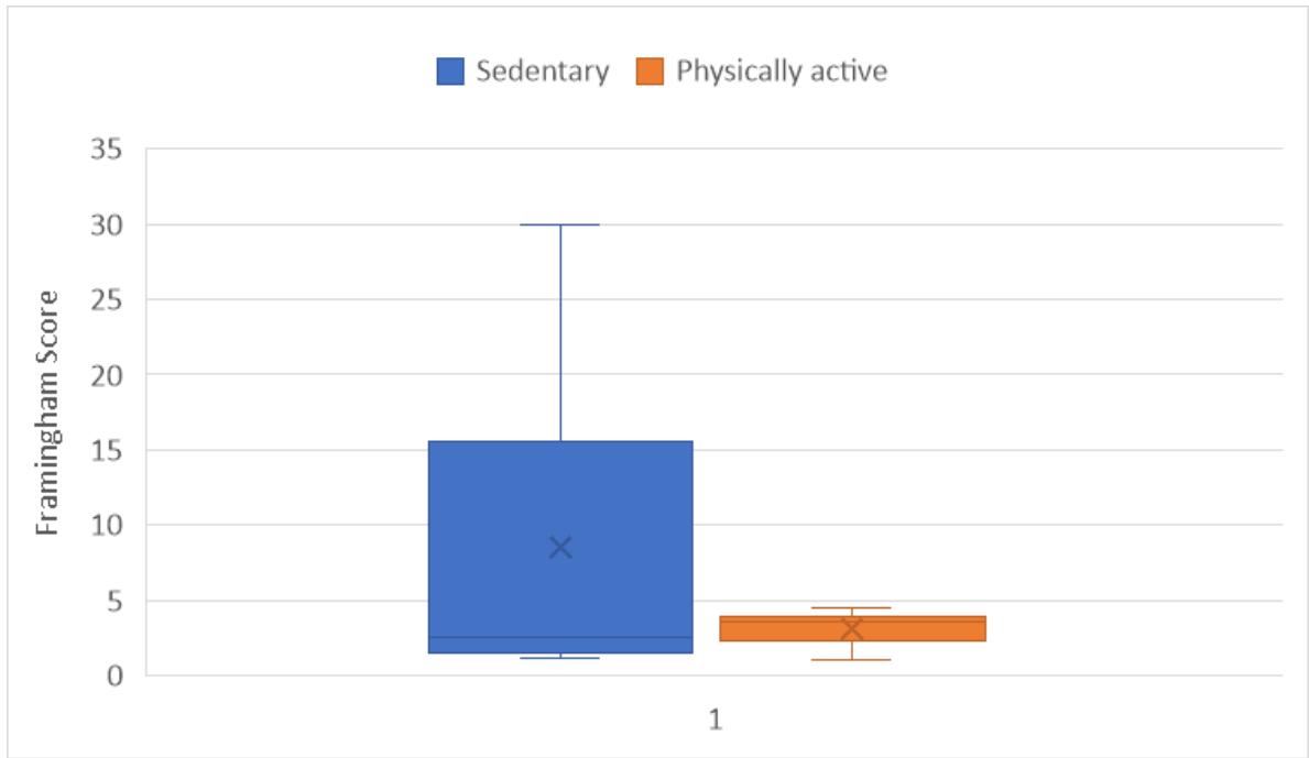 The Framingham score was evaluated for physically active and sedentary participants. It was found that the cardiovascular risk was significantly increased for those participants who were sedentary compared to those who were physically active $p = 0.003$, figure 4.