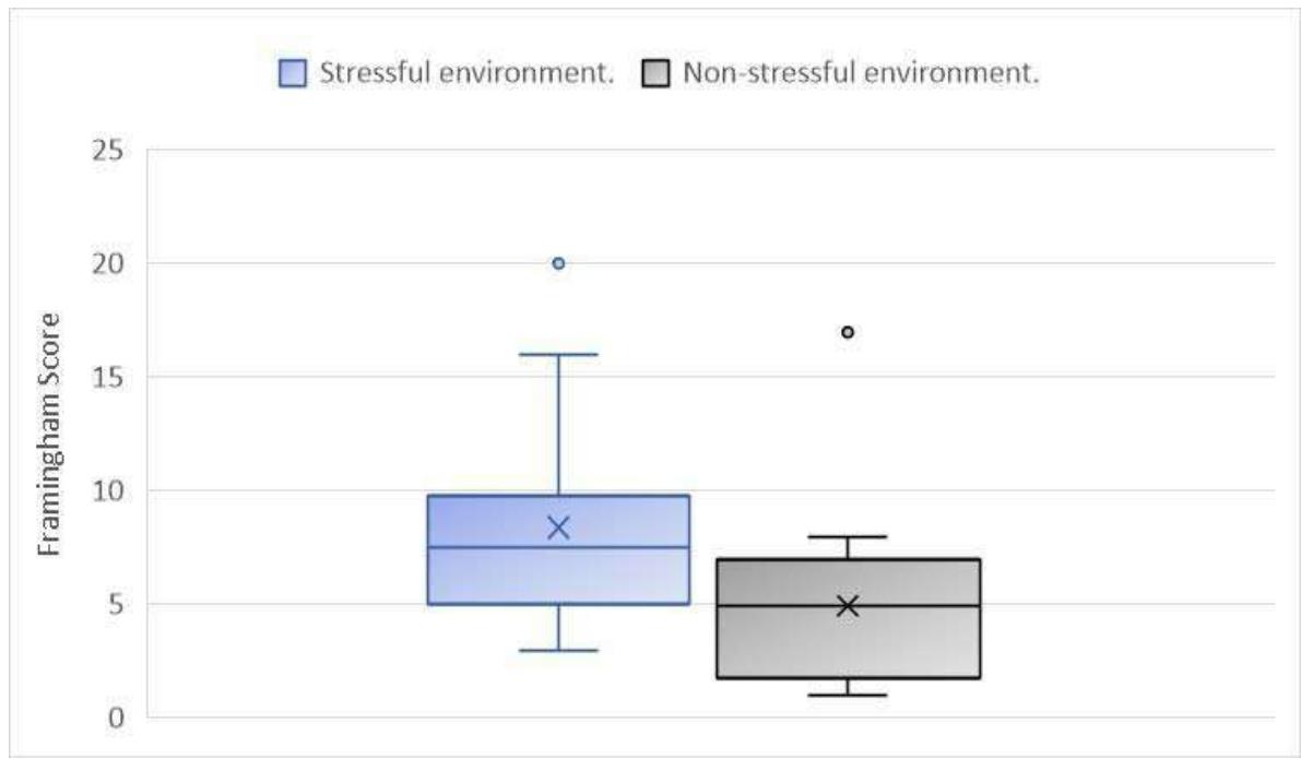 The Framingham score was evaluated for the participants who reported living or not living in a stressful environment. It was found that cardiovascular risk was significantly increased for those participants who reported living in a stressful environment (p=0.03, Figure 2).