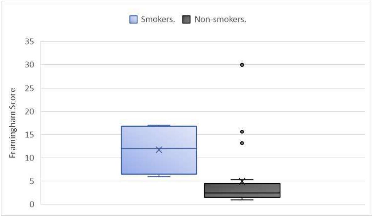 The Framingham score was evaluated for the groups of smokers and non-smokers. It was found that the cardiovascular risk was significantly increased for smokers compared to non-smokers $p = 0.03$, figure 3.